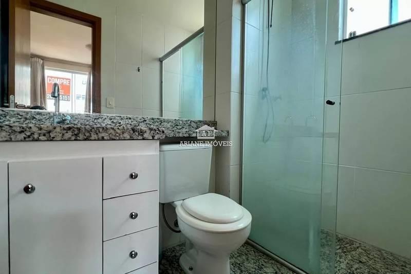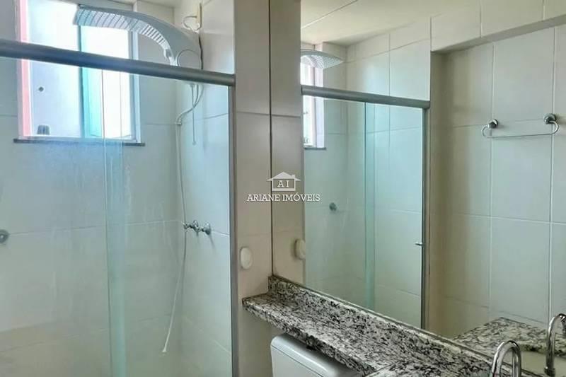 Banheiros (social e suíte) com bancadas em granito e piso em porcelanato.